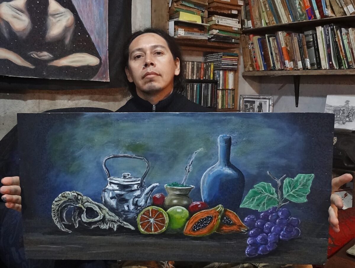 El músico y artista plástico se encuentra presentando su primera muestra individual de pinturas en el hall de entrada del Centro Cultural.