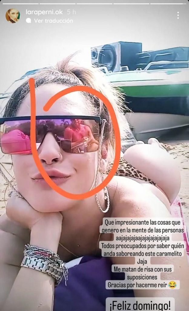 Es que la blonda, disfrutó del sol y del río Paraná en la Isla del Medio junto con amigos realizando varios videitos para mostrar su disfrute a sus seguidores. Pero al parecer, mostró de más y en uno de los paneos que realizó a su cuerpo mientras tomaba sol, reflejó en sus lentes ahumados a un hombre mayor que se encontraba frente a ella.